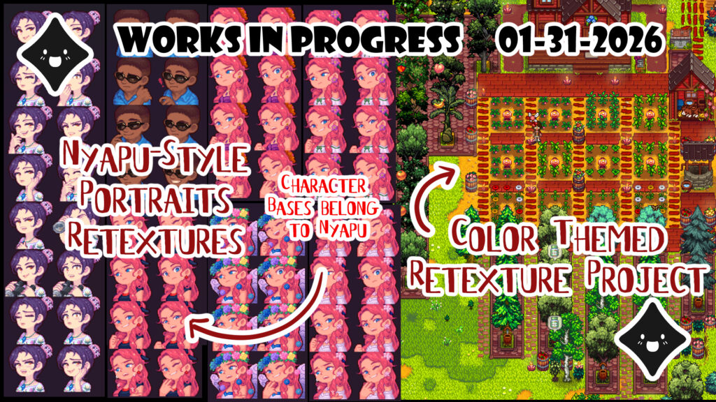 • Rose in Sand: I wanted to finish something simple this week, and since I already had several of Sandy’s retextures done, I was able to add the extras easily. That being said… the coding was a nightmare. I tried to make this mod work on top of my other Nyapu Seasonal mods, and it wasn’t happening. I’ll add compatibility to my seasonal Nyapu mods after I finish a few more projects, so I’m not constantly updating old ones.